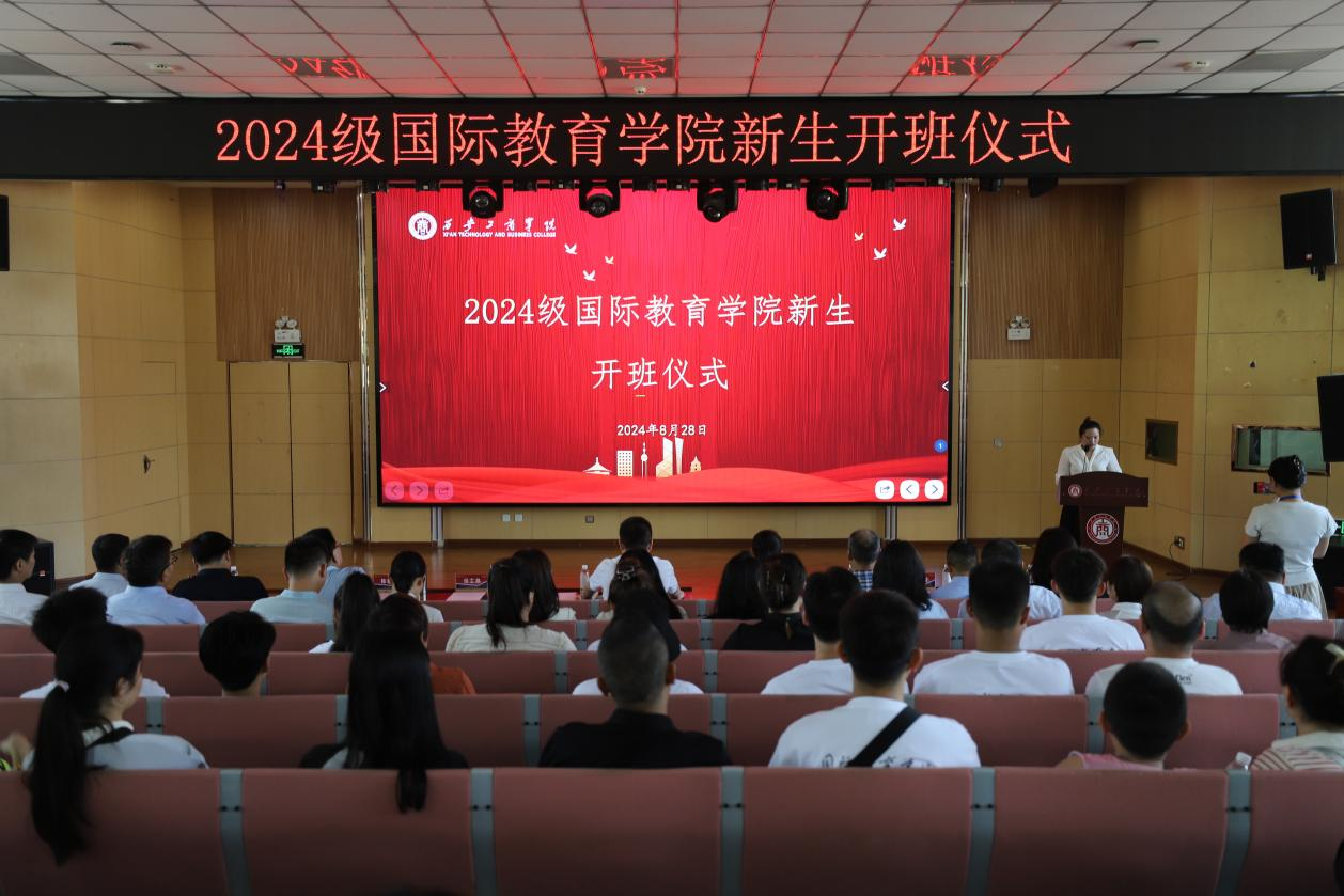 在学术报告厅开展了2024级国际教育学院新生开班仪式,西安工商学院副董事长、常务副校长龙和平,向同学们介绍了学校“以学生