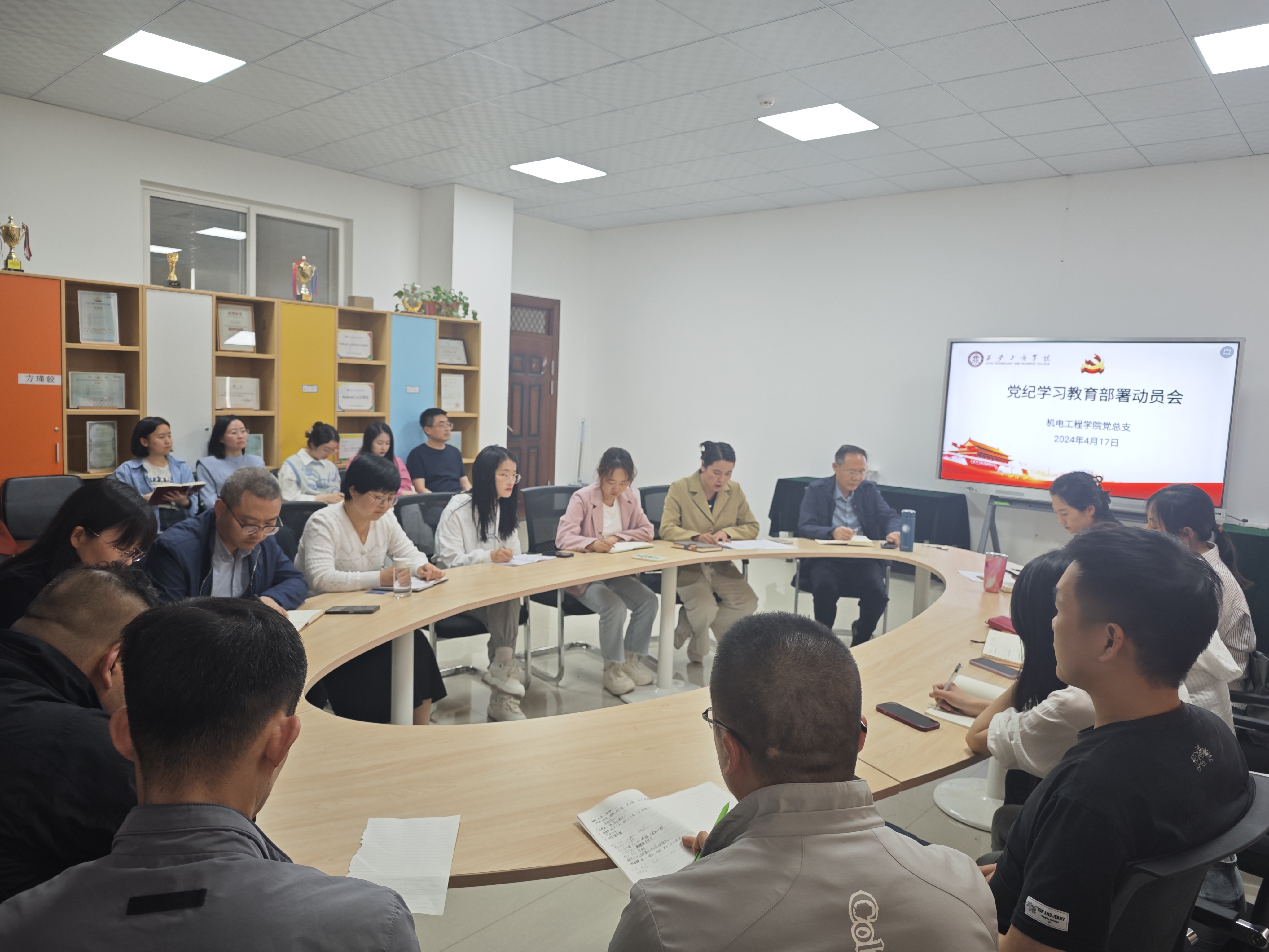 为深入学习贯彻习近平总书记关于党纪学习教育的重要讲话和重要指示精神,落实学校党委的工作部署要求,4月17日下午,机电工程学院党总支在实验楼301会议室召开党纪学习教育动员部署会,学院领导班子成员与全体教职工党员参加会议,党总支书记罗艳主持会议并对学院开展党纪学习教育进行了安排部署。