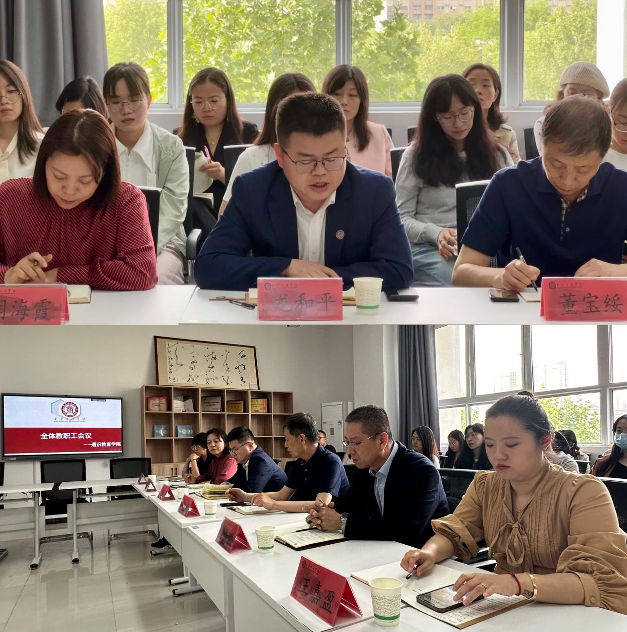 4月22日上午,西安工商学院通识教育学院(含国际教育学院)召开全体教职工大会,宣布学院干部任职决定。副董事长、常务副校长龙和平,校党委副书记、纪委书记杨红雨,人事处处长闫海霞,通识教育学院院长董宝绥,国际教育学院院长王嘉盈,新任教学副院长虞新学和学院在职教职工参加大会。会议由闫海霞处长主持。
