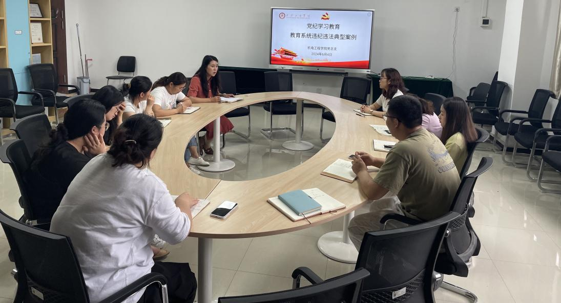 6月4日上午,机电工程学院党总支在会议室组织全体教工党员开展了“党纪学习教育——教育系统违法典型案例”主题党日活动,旨在深入学习贯彻新修订的《中国共产党纪律处分条例》(以下简称《条例》),通过教育系统内的具体案例剖析,增强党员教师的纪律意识和规矩意识。