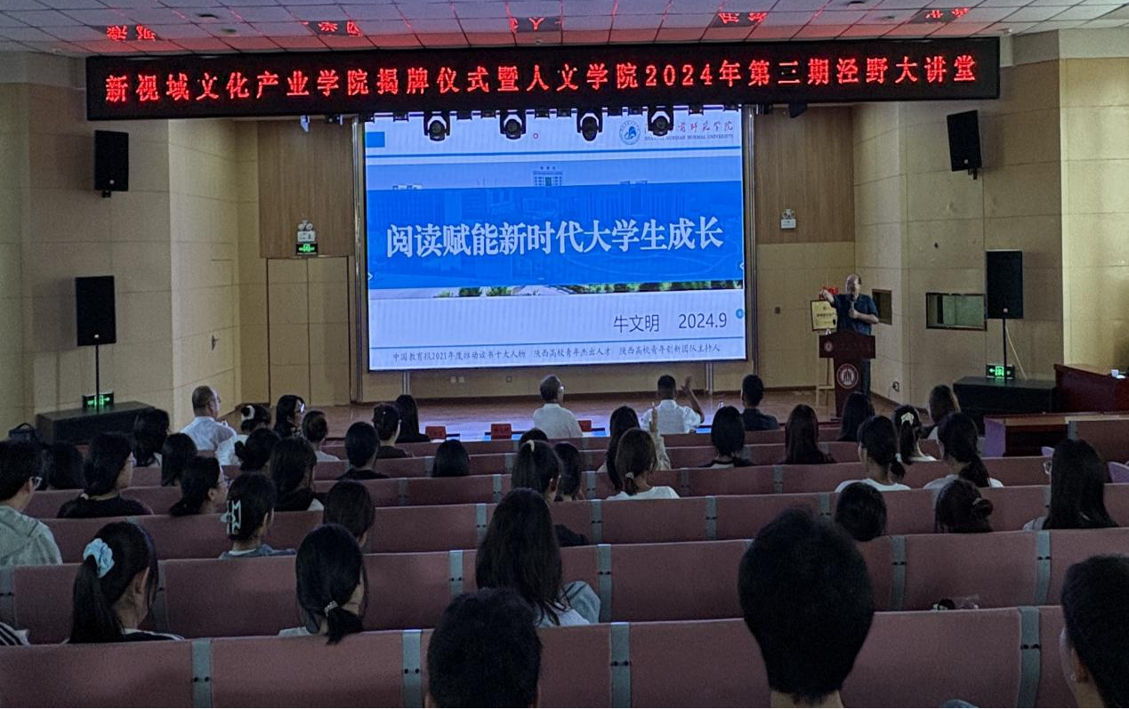 揭牌仪式后,举行了人文学院2024年第三期泾野大讲堂活动,邀请陕西学前师范学院文学院院长牛文明教授作了以《阅读赋能新时代大学生成长》的主题讲座。牛文明教授始于习近平总书记对广大青年的号召,从“新时代大学生阅读的价值”、“新时代大学生阅读的内容”、“新时代大学生阅读的方法”等方面进行了分享。