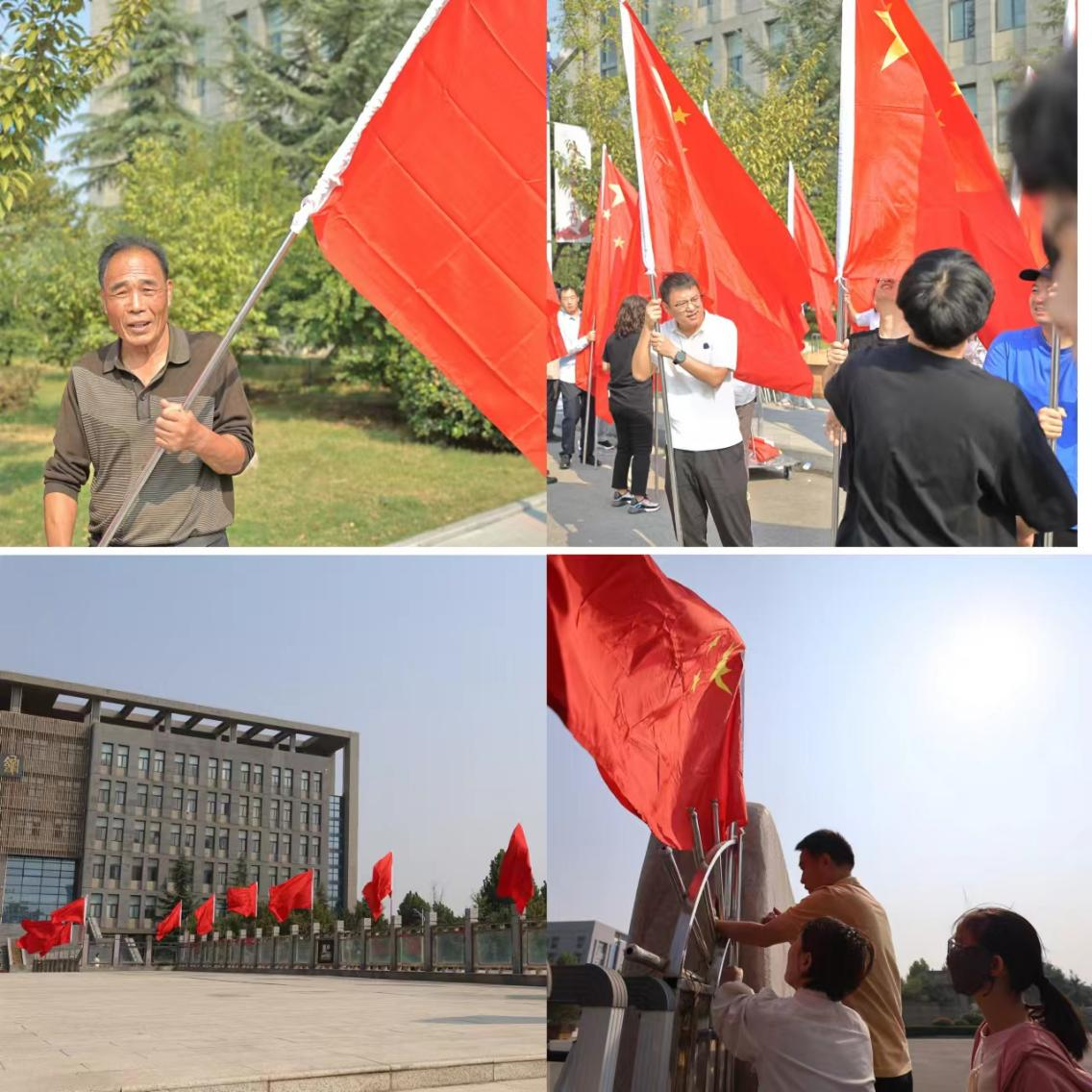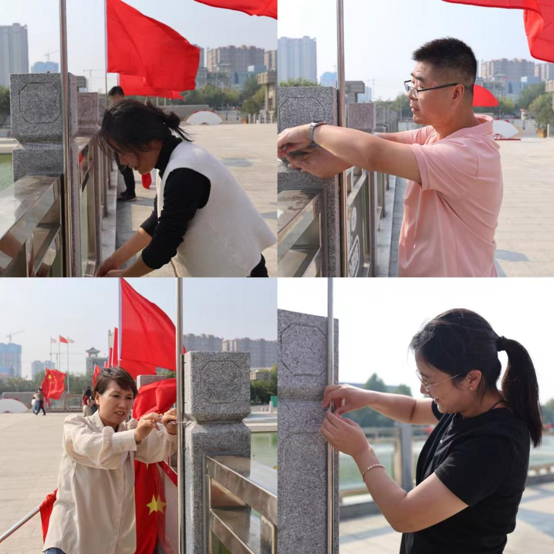 各位老师分别在教学楼、实验楼、泮池等地悬挂国旗及红旗,现场气氛热烈,不一会儿一抹抹“中国红”就随风飘扬起来,形成校园里一道靓丽的风景线,不少师生纷纷驻足欣赏,此次活动营造了热烈的节日氛围,充分激发了我校师生更加浓厚的爱国热情。
