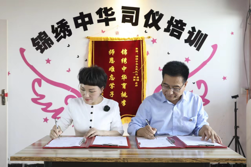 最后,艺术与传媒学院院长陈敏直与锦绣中华司仪培训公司负责人翁锦共同为人才培养基地签约授牌。