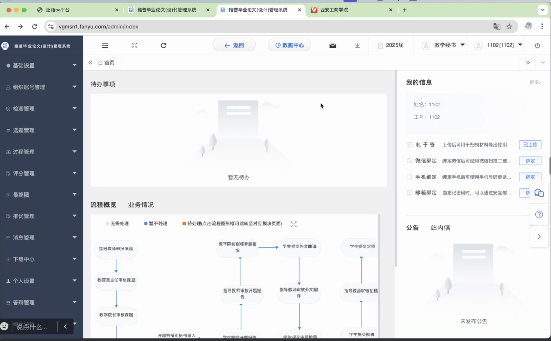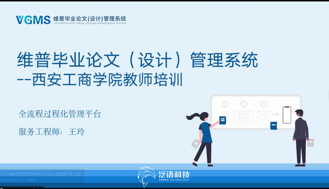 王工程师以实际系统流程图为主线,直观且清晰地介绍了系统的各模块的功能和操作方式,并通过系统演示的方式,着重对申报课题、学生选题、定稿与最终稿检测、指导日志提交、系统评分等五个方面进行培训。