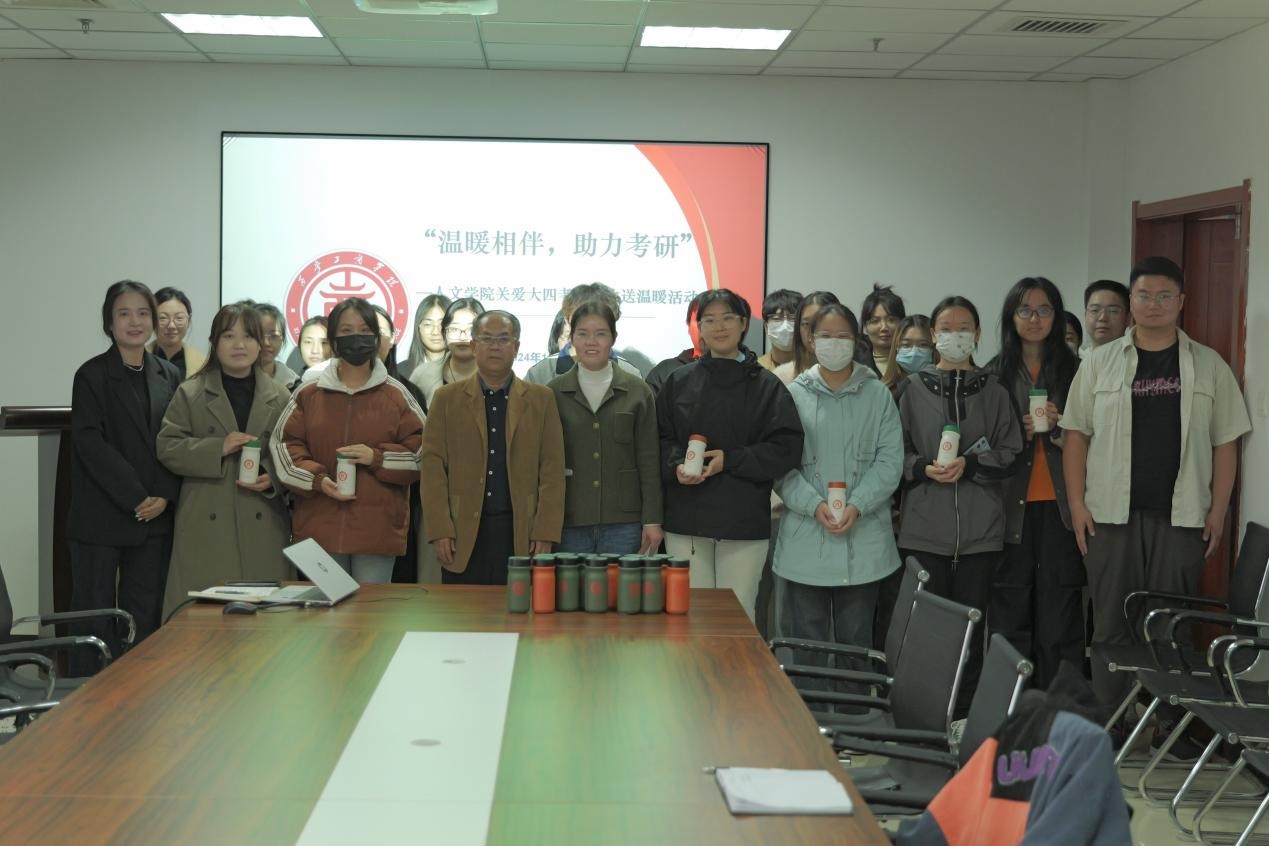 随后,由学院党总支书记范诚梅作总结发言,她勉励人文考研学子在最后冲刺阶段:一要劳逸结合,照顾好自己的身体,保持健康体魄和充沛的学习精力;二要合理安排时间,科学复习,提高学习效率;三是保持定力,坚持到底,不轻言放弃。活动最后,由学院院长、党总支书记为大四考研学生发放保温杯,希望同学们带着学院的祝福,奔赴下一场山海!