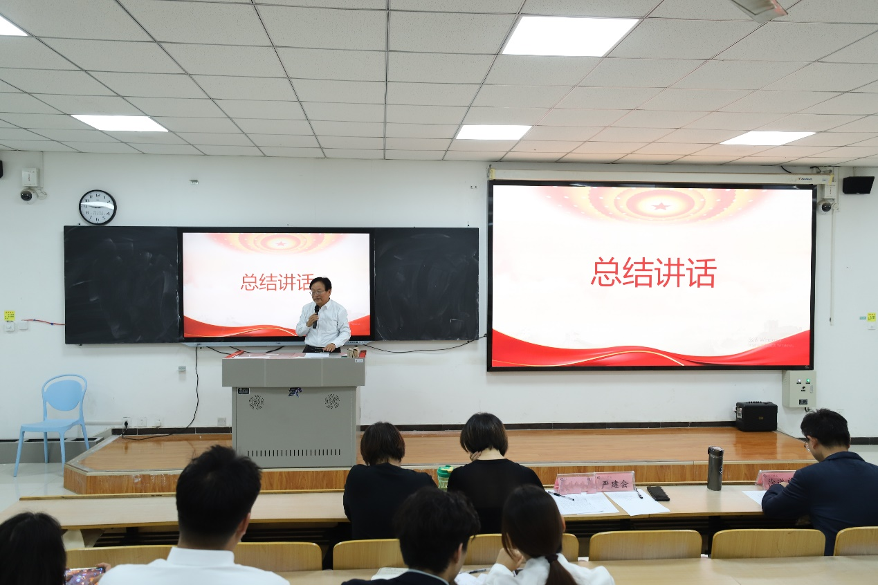 经过两个小时的激烈角逐,所有团队均完成了精彩的展示。马克思主义学院院长严建会教授为本次活动作总结致辞。他首先对参赛同学们的出色表现给予了高度评价和热烈祝贺,认为同学们的宣讲有深度、有温度、有力量,充分展现了新时代大学生昂扬向上的精神风貌和深厚的家国情怀。