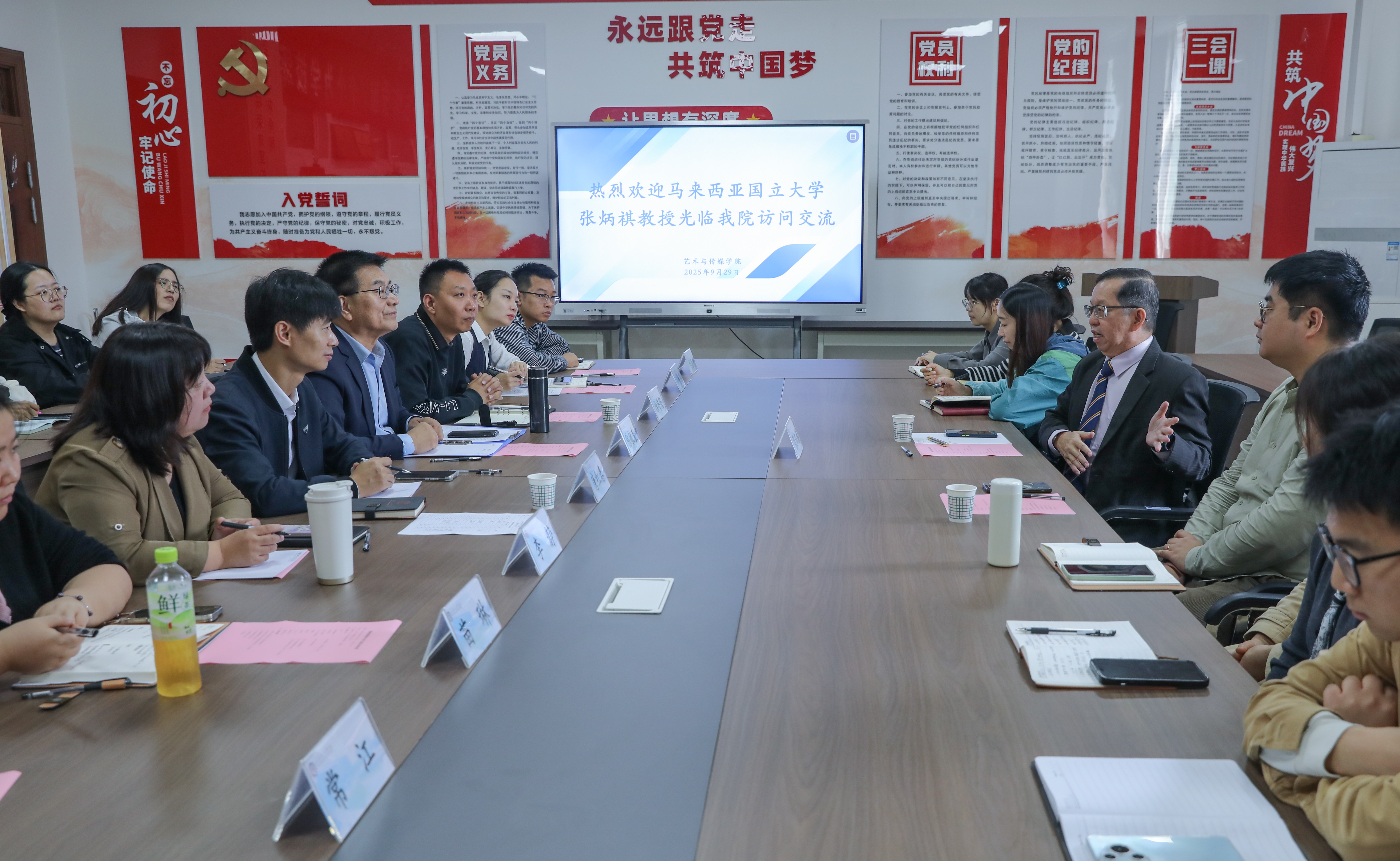 9月29日上午,艺术与传媒学院在实验楼301会议室召开跨文化交流与传播座谈会。马来西亚国立大学研究员、博士生导师张炳祺教授受邀到访,与我院教师围绕跨文化交流与传播等多维度展开深入交流与研讨。本次座谈会由艺术与传媒学院院长陈敏直主持,学院领导班子、系主任、教师代表与全体辅导员共同参会。