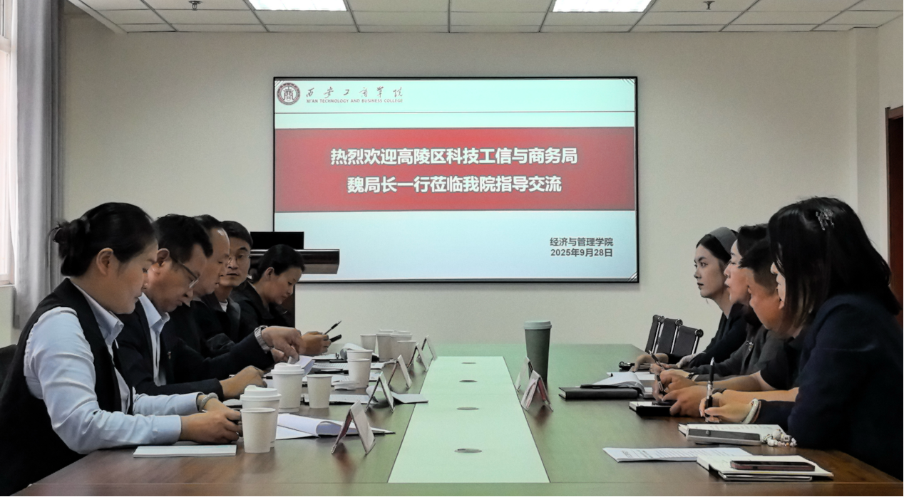 为进一步深化政校企合作、凝聚多方合力推动民办高校高质量发展,9月28日下午,西安市高陵区科技工信与商务局党委委员、副局长魏宏志、市场运行科科长史全、市场运行科张培、中国农业银行西安高陵区支行行长张晓洲一行莅临西安工商学院经济与管理学院开展专题调研指导工作,与经济与管理学院院长张雪鹏及骨干教师就专业建设、产教融合开展深度指导交流,为政校企资源对接、共建无边界育人平台,及我校经管类专业人才培养赋能增效。
