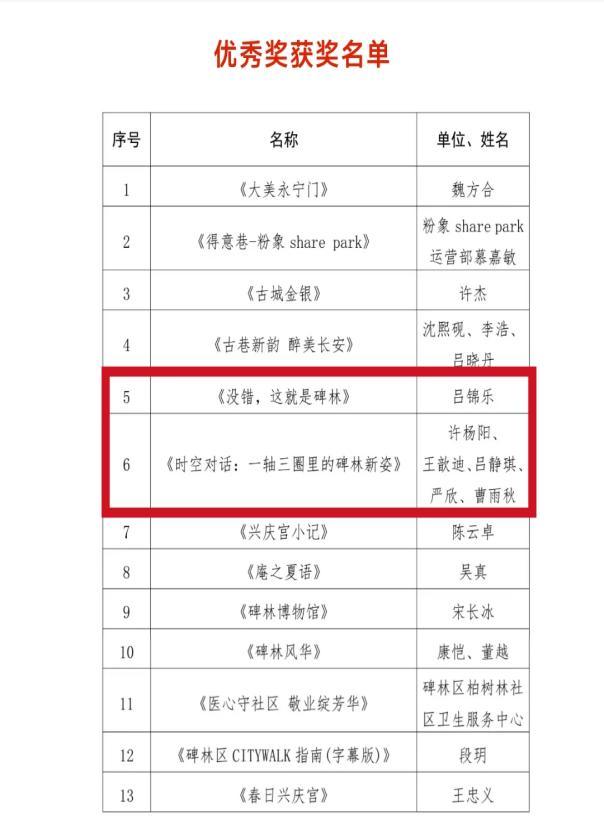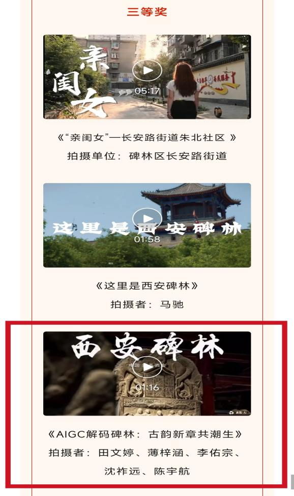 《AIGC解码碑林:古韵新章共潮生》由田文婷、薄梓涵、沈祚远、李佑宗、陈宇航同学创作,荣获三等奖;《时空对话:一轴三圈里的碑林新姿》由许杨阳、王歆迪、吕静琪、严欣、曹雨秋同学创作,荣获优秀奖;《没错,这就是碑林》由吕锦乐同学创作,荣获优秀奖。以上获奖作品均由新闻传播系樊生富老师指导完成,作品以独特的视角生动展现了碑林区的文化底蕴和时代风采。