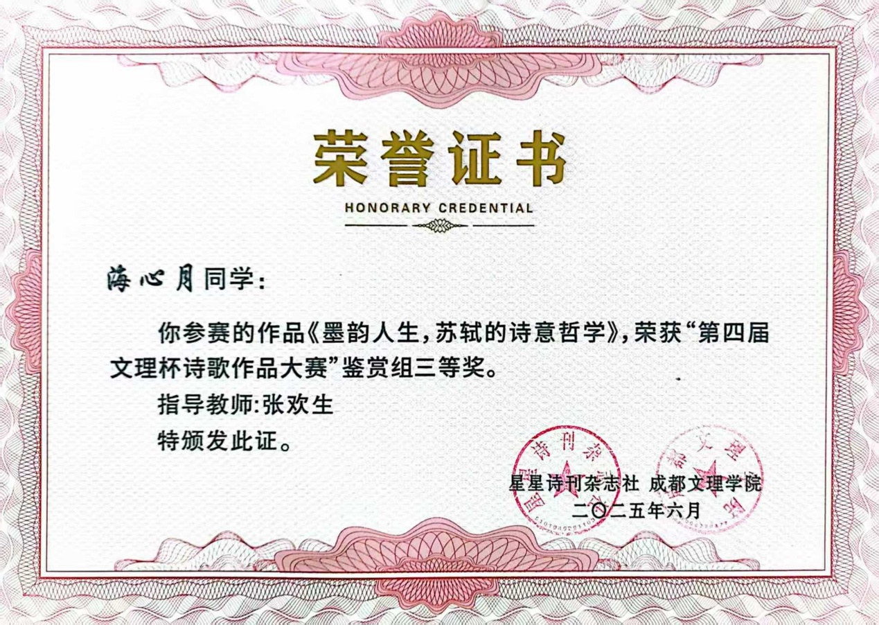 海心月同学在鉴赏组中凭借《墨韵人生,苏轼的诗意哲学》获三等奖。