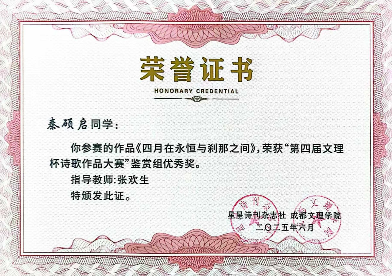 秦硕启同学在创作组中凭借《我见》获优秀奖,其作品收入《第四届“文理杯”诗歌作品大赛创作组》获奖作品集。