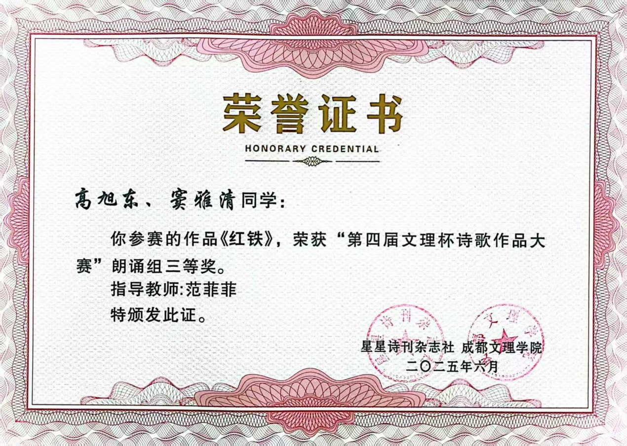 高旭东和窦雅清同学参赛的作品《红铁》,荣获“第四届文理杯诗歌作品大赛朗诵组三等奖。
