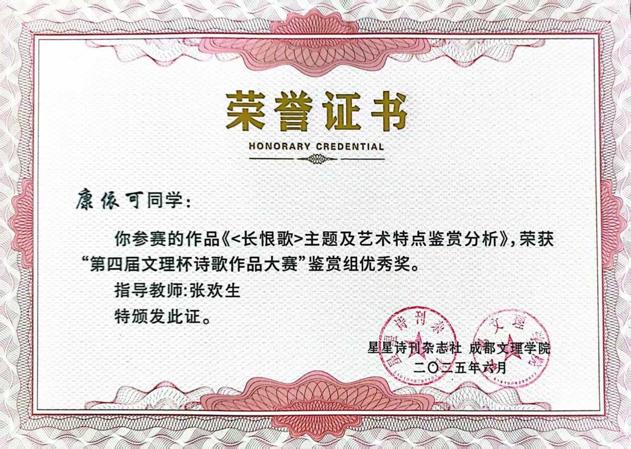 秦硕启同学的《四月在永恒与刹那之间》与康依可同学的《<长恨歌>主题及艺术特点鉴赏分析》在鉴赏组获得优秀奖。