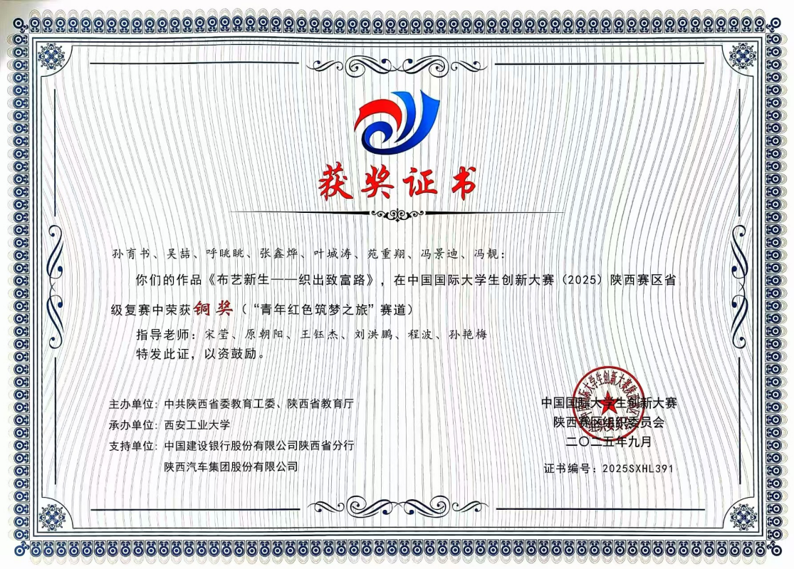 近日,中国国际大学生创新大赛(2025)陕西赛区比赛结果公布,人文学院的参赛项目《布艺新生——织出致富路》荣获省级铜奖,为西安工商学院赢得了荣誉。