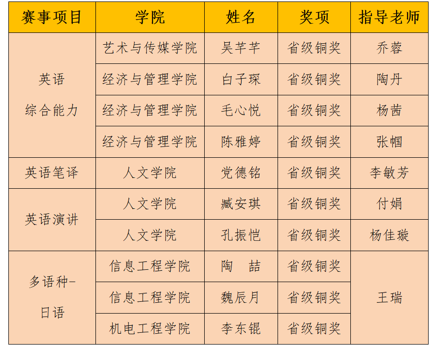 赛事有期,初心不改;奋斗不止,未来可期。此次省赛的成绩,既是对我校外语教学工作的肯定,更为后续教学改革与人才培养注入了强劲动力。通识教育学院英语教研室将以此为契机,持续深化“以赛促学、以赛促教、以赛促改” 的育人理念,进一步加强学生外语实践能力、跨文化沟通能力与国际传播能力的系统培养。学校也期待全体学子以获奖同学为榜样,在外语学习的道路上勤学善思、勇于突破,以语言为桥、以青春为笔,在国际舞台上主动传递中国声音、讲好中国故事,用实际行动书写新时代青年的责任与担当!