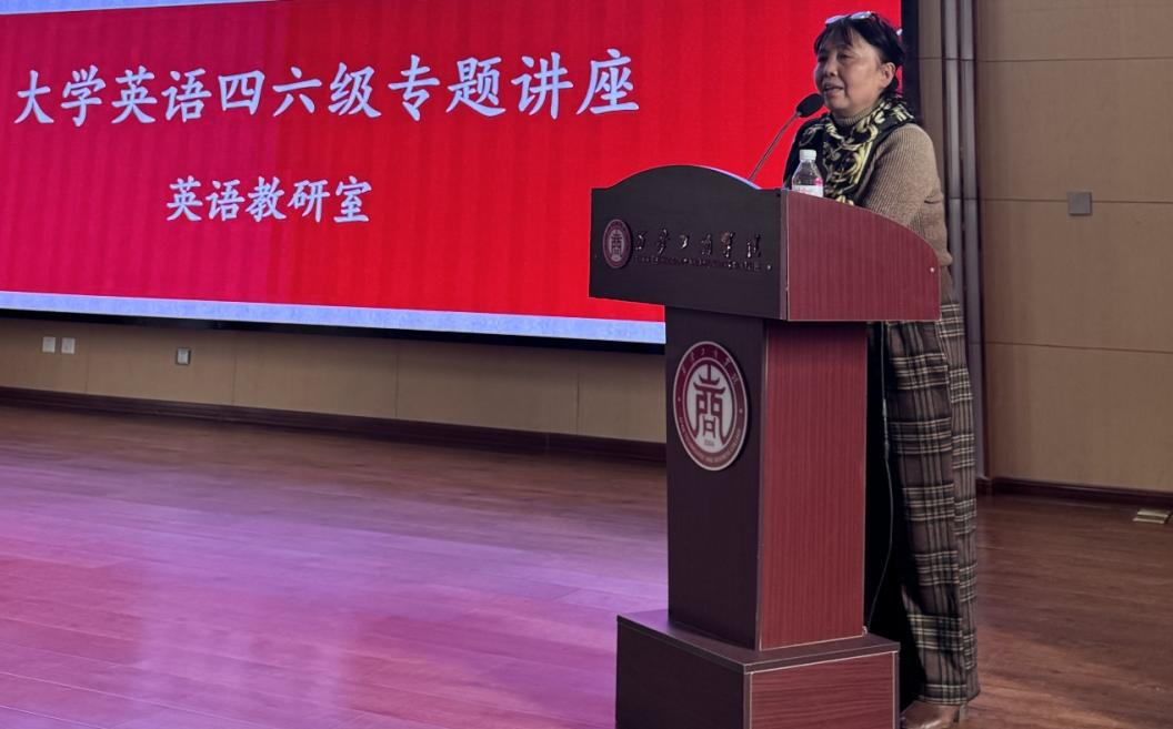 讲座尾声,张化丽院长总结发言。她首先代表西安工商学院通识教育学院,对范晓晖副教授的倾情分享与毫无保留的经验传授表示衷心感谢,强调本次讲座是学校落实“以学生为中心、以能力为重点”育人理念的重要举措,也是通识教育学院完善学生知识结构、提升通识素养的具体实践。西安工商学院始终高度重视学生英语综合能力培养,通过构建 “基础课+高阶课+个性化”的大学英语课程体系,为学生搭建了全方位的语言提升平台,而本次四六级专题讲座正是学校优质教学资源整合的又一体现。她鼓励全体考生以本次讲座为新的起点,将所学技巧内化于心、外化于行,在接下来的备考中勤学苦练、查漏补缺,充分利用学校提供的教学支持与师资优势,以饱满的信心和扎实的准备迎接十二月的考试挑战。