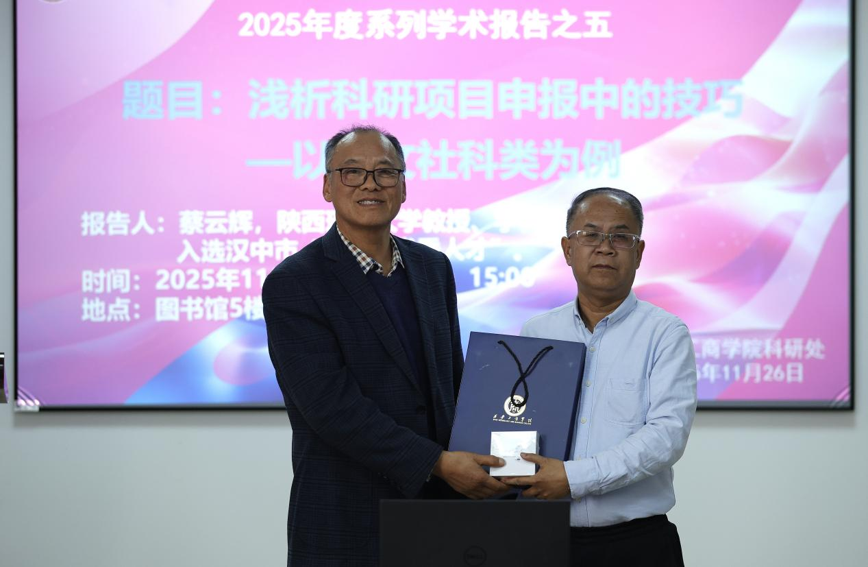报告会伊始,过仕明代表科研处向主讲嘉宾蔡云辉院长赠送了纪念品并合影留念。